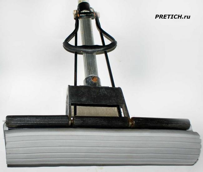 Все, естественно, подходит отлично. Вот так она смотрится на швабре… Швабра у меня, как я говорил, уже старенькая, но прочная: телескопическая ручка из алюминия, из алюминия же и кронштейн. Отжимной механизм из стальных элементов и пластмассовые валики – именно они и отжимают губку. Этот механизм иногда ошибочно называют “механизм отжима типа бабочка” – это не так. Бабочка немного иной механизм, там не используются валики, там губка складывается пополам (как крылья бабочки), и выжимает сама себя.