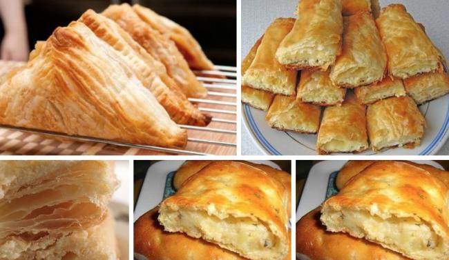 - Слоеное тесто. Оно тоже бывает с дрожжами. Рогалики, круассаны и другая выпечка получается очень пышной, легкой, имеет слоистую структуру, содержит большое количество жира.