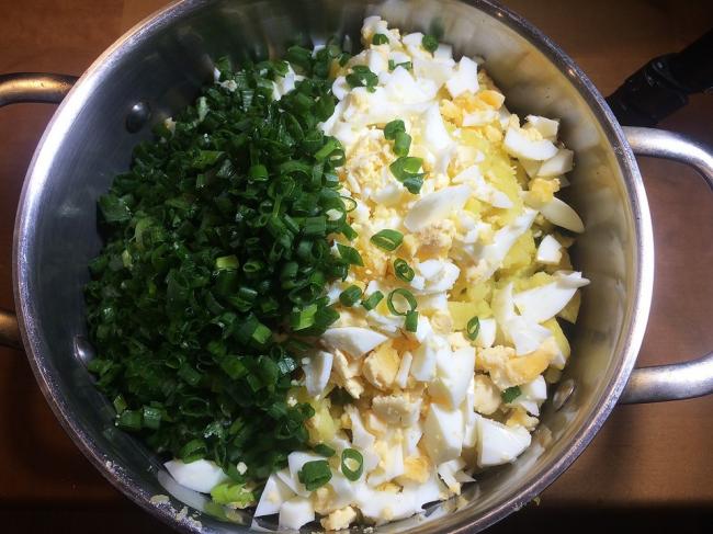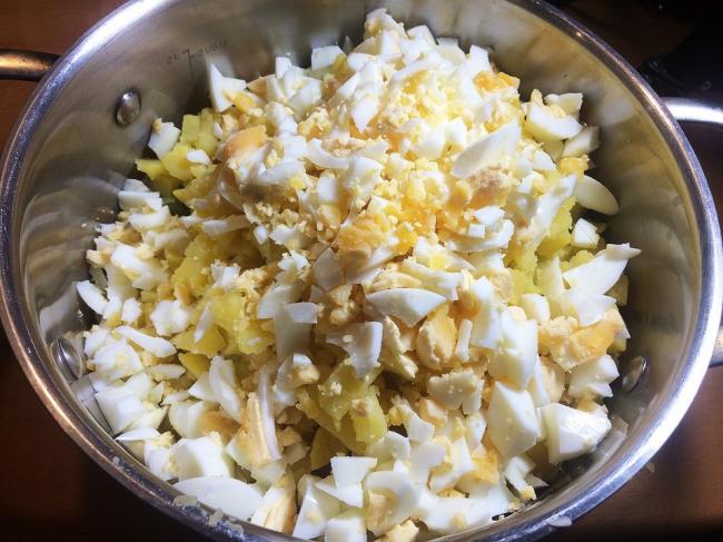 К этому моменту картофель уже сварился, я слил с него воду и поставил остывать. Яйца остудил под холодной водой, чтобы скорлупа лучше отделялась. Теперь очищаем картошку и нарезаем мелким кубиком. Если она крахмалистая, то нарезать будет непросто, картофель будет липнуть к ножу, но филигранность здесь не требуется. Яйца рубим вообще произвольно, но не в труху. Отправляем всё в кастрюлю.