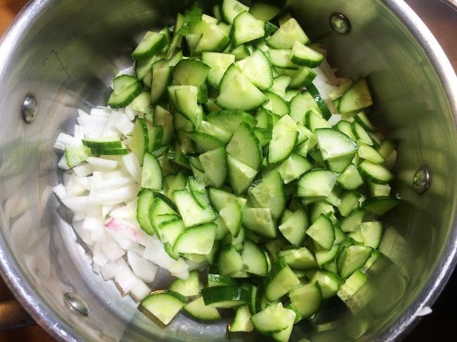Дальше нарезаем огурцы. По канону нарезать можно кубиками, но тут кто как любит. Конечно, желательно использовать грунтовые пупырчатые огурчики небольшого размера. А в реальности берём то, что есть в продаже. Потому что окрошка должна быть быстрым блюдом, иначе нет смысла. Погода испортится – и всё!