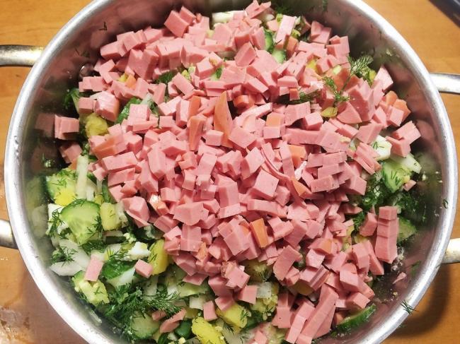 - Колбасу, вареные яйца и отварной картофель нарежь кубиками.