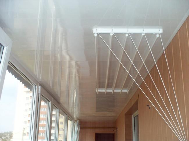 - Веревки, натянутые под потолком балкона, позволят не выставлять нижнее белье на всеобщее обозрение. Трос должен быть расположен вдоль помещения. Конструкция крепится на потолок или стены.