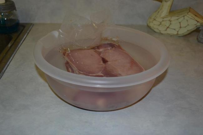 Для этого нужно взять мясо в заводской упаковке или в плотно завязанном полиэтиленовом пакете и отправить в таз с прохладной водой или наполненную раковину с предварительно закрытым сливом. Кусок должен быть практически полностью покрыт жидкостью.