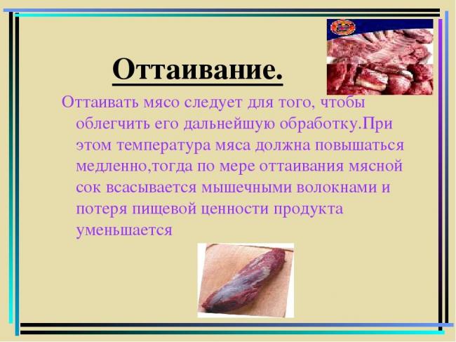 - любую размороженную мясную продукцию рекомендуется хранить не более 8 часов.
