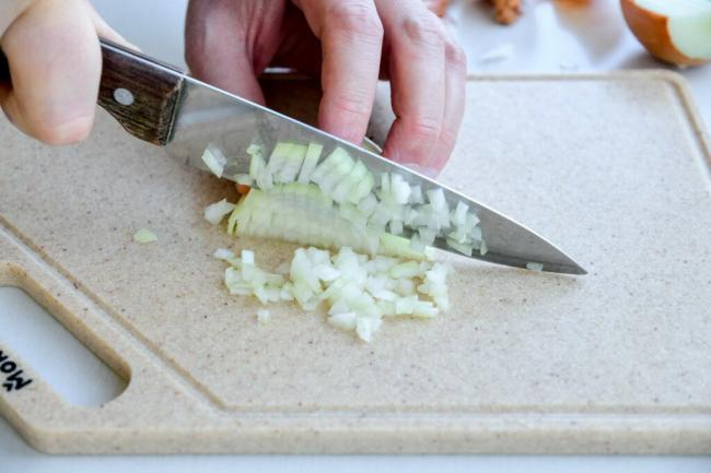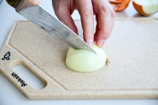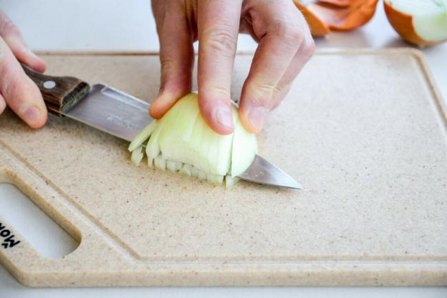 Основы нарезки лука применимы и к другим продуктам: очищаем от кожуры, разрезаем пополам, кладем широкой стороной вниз, а затем нарезаем на мелкие кусочки. Согласитесь, кажется все просто. Но есть один секрет.