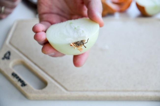 Давайте прямо сейчас нарежем лук! Берем луковицу, срезаем верхушку и разрезаем луковицу пополам. Корешок лука оставляем невредимым. Теперь кладем одну половинку лука срезом на доску и делаем вертикальные надрезы, но не до конца, чтобы корешок оставался целым, в этом и кроется секрет.