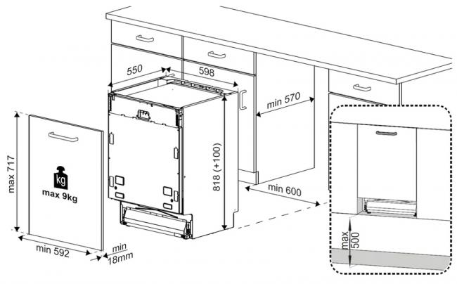 Средние размеры компактной машины: 550х500х438 (ШхГхВ). В отличие от отдельностоящей модели, для встраиваемой обязателен мебельный модуль, подходящий по габаритам