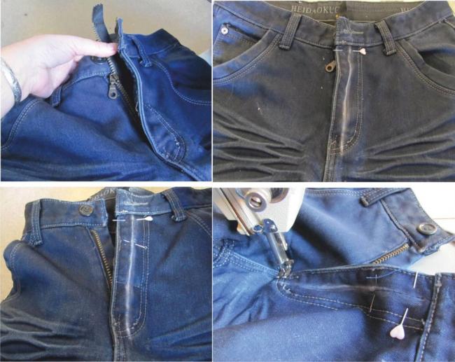 первоначально, необходимо выпороть старый замок джинсов. Для этого распарывается отделочная строчка, прикрывающая молнию с лицевой стороны и стежки на поясе;