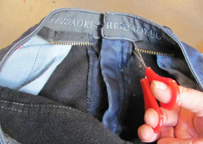 и также необходимо восстановить распоротые строчки на поясе и закрепить гульфик молнии с изнаночной стороны