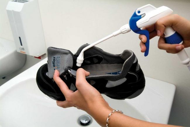 Перед использованием, обувь выдерживают еще несколько часов для окончательного просушивания и выветривания. Быстрее и легче обеззараживание проводится спреем, в этом случае проще контролировать дозировку состава, нет нужды в постоянном смачивании тампона.