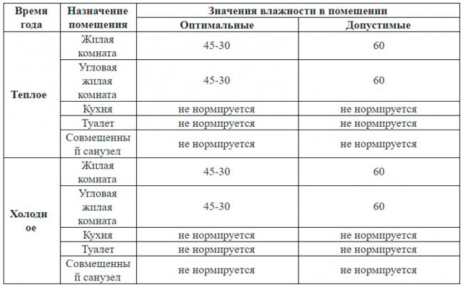По каким-то околонаучным данным человек в среднем состоит из воды на 60%. И для полноценной жизнедеятельности человеку необходим определенный уровень влажности. Этот уровень вывели врачи и ученые (не британские), и зафиксировали в нашем обыкновенном российском государственном стандарте. ГОСТ 30494-2011 «Здания жилые и общественные. Параметры микроклимата в помещениях» устанавливает оптимальные и предельно допустимые нормы влажности. Интересующие нас данные приведем в таблице.