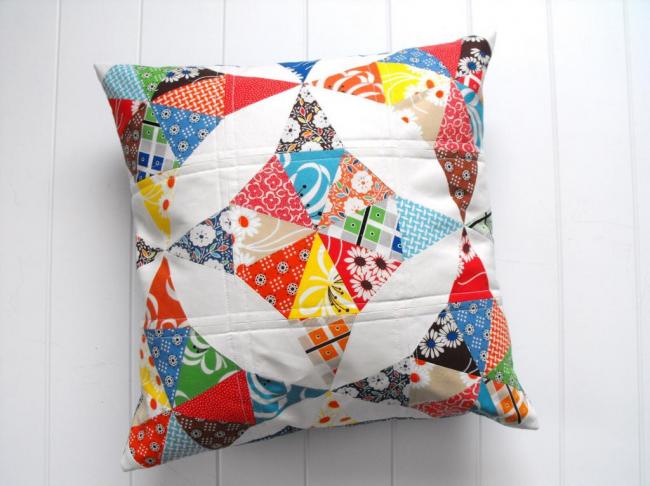 С помощью подобных материалов легко получится добиться винтажного эффекта. Не стоит зацикливаться на определенной форме подушки. Помимо квадрата, можно использовать любые геометрические фигуры. Если нужно сделать подушку в качестве подарка кому-то, то можно создать изделие в виде буквы или цифры. Также подушки можно изготовить не из цельного куска ткани, а сделать наволочку-мозаику. Вырезать квадратики из разных тканей, которые впоследствии просто пришить к одному пласту ткани, чтобы они хорошо держались. Такая идея будет не только оригинальной, но и интересной, так как можно экспериментировать с разными тканевыми расцветками.