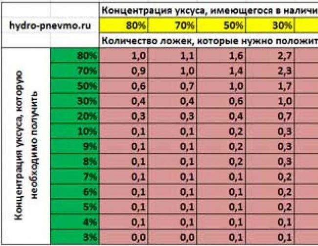 Возьмем 1 столовая ложку уксусной эссенции и добавим к ней нужное количество ложек воды:9% – добавляем 7 столовых ложек холодной воды;6% – добавляем 11 столовых ложек холодной воды;3% – добавляем 22 с половиной столовых ложек холодной воды.