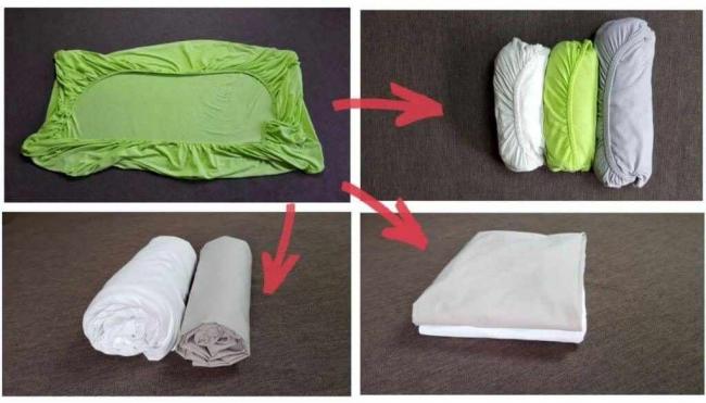 Правильно сложить простынь на резинке — значит соединить стороны пополам, но резинкой наружу. Затем надо загнуть края, чтобы они встретились посередине. Если перевернуть белье, то можно увидеть образовавшийся карман. Остается свернуть ткань в рулон и вывернуть кармашек. Хранить так простынь очень удобно. Материал не образует заломов.