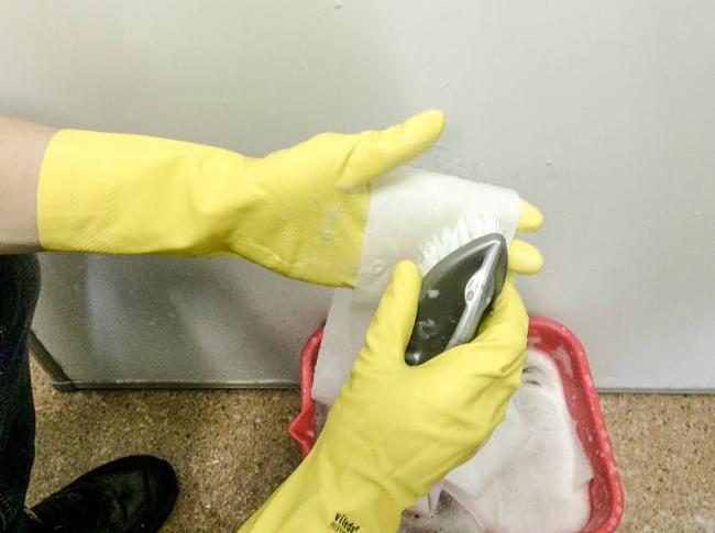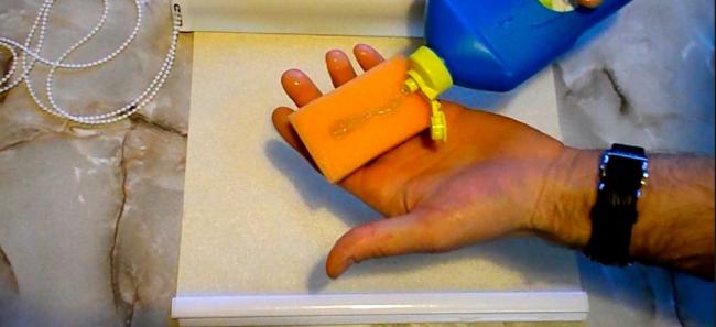 - Если есть места, где грязь не отошла сама, то это место можно потереть мягкой кухонной губкой, смоченной в моющем растворе.