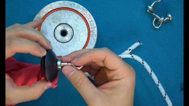 - Резинка для волос. Аксессуар помещают между тканью и выпуклой частью магнита, которая вращается, и продвигают до тех пор, пока резинка не зацепится плотно, а стержень не окажется свободным – тогда можно начинать обе части отодвигать в разные стороны до полного открытия.