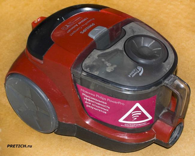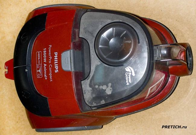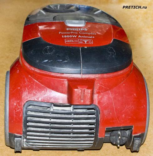 Итак, видим съемный пластиковый бункер, и фиксирующую его кнопку. Затем в виде подковы еще две кнопки: одна включение и выключение устройства, вторая – сматывание шнура (как обычно). Надписи: логотип Philips, затем Power Pro Compact и 1800W и Animal+…