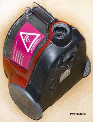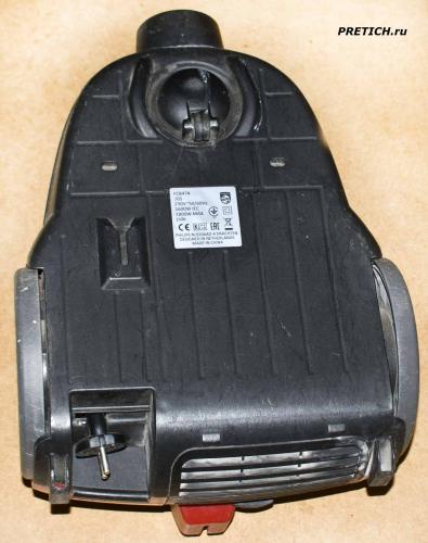 Здесь мы видим место, куда подсоединяется шланг. И ручка для переноса пылесоса. По бокам два больших колеса и впереди одно маленькое, поворотное…