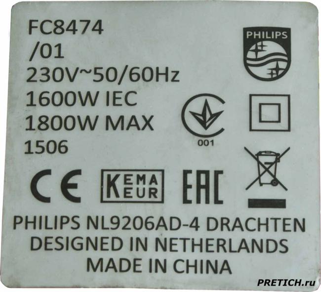 Есть этикетка и на ней мы читаем: название модели – FC8474 /01 230V~50/60Hz 1600W IEC 1800W MAX Philips NL9206AD-4 Drachten Designed in Netherlands… Сделано в Китае… и значки сертификаций и соответствия разным требованиям…