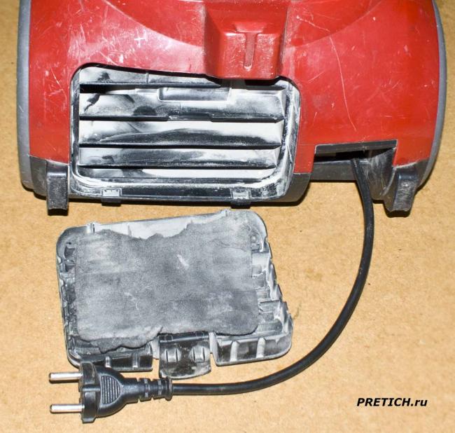 На выходе решетка с окончательным фильтром – он весь забит пылью и уже явно изношен… да – пылесос поработал на славу.
