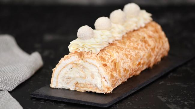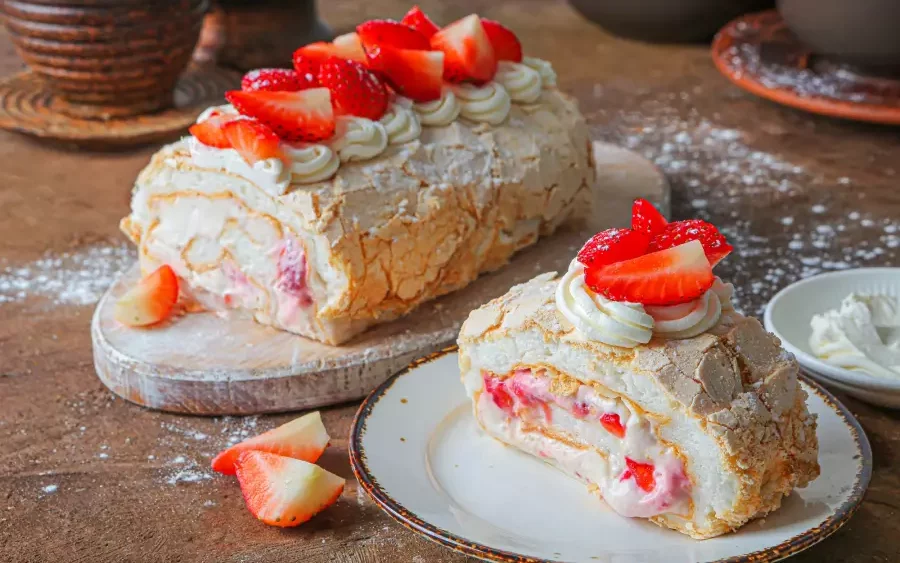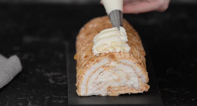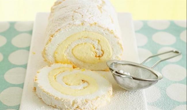 Взбей в пышную пену белки с сахарной пудрой. Добавь крахмал и уксус, и аккуратно перемешай. Выложи массу ровным слоем на пергамент и отправь в духовку на 25 минут при 180 градусах. Немного охлади меренгу, смажь кремом, сверни рулет и оставь его на 2 часа в холодильнике.
