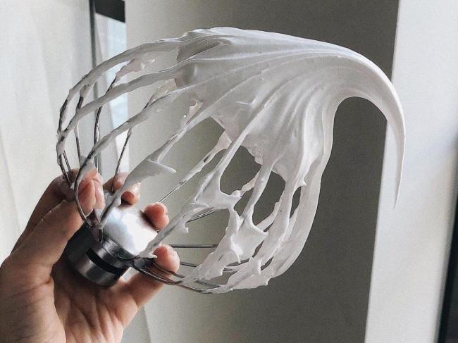 В этот момент не должно оставаться сырого не взбитого белка. Он должен быть воздушной пеной в мелких пузырьках воздуха.