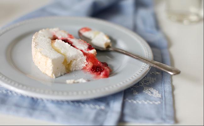 Тебе понадобится: 4 яичных белка, 150 г сахарной пудры, 1 ст.л. лимонного сока, 1 ст.л. крахмала, 3 ст.л. дробленых грецких орехов, 150 г творога, 2 ч.л. сметаны, 2 горсти ягод.