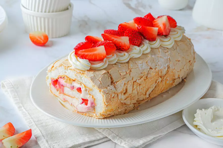 Взбей белки с солью до пышных пиков и добавь оставшийся сахар. Когда масса станет плотной, добавь крахмал с лимонным соком, перемешай и выложи на пергамент. Запекай корж около 40 минут в духовке при 160 градусах, переверни и дай остыть. Смажь его кремом, посыпь ягодой и сверни из меренги рулет. Отправь его на ночь в холодильник.