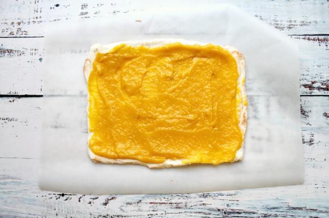 Бруснику заранее выложить в сотейник и бланшировать в кипятке 2 минуты. На пласт выложить еще один лист и перевернуть. Подложку удалить и посыпать частью пудры, приступить к сборке. Сначала промазать сверху яблочным пюре, затем выложить ягодки, оформить трубочкой. Если с первого раза аккуратно свернуть не получается, можно нарезать квадратиками и сделать двухслойные пирожные.