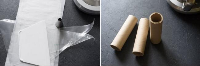 Переложить в корнет с насадкой 14 мл или плотный пакет с надрезанным уголком. Разрезать втулку от пекарской бумаги на 3 части по 20 см и располовинить, затем подготовить листы.