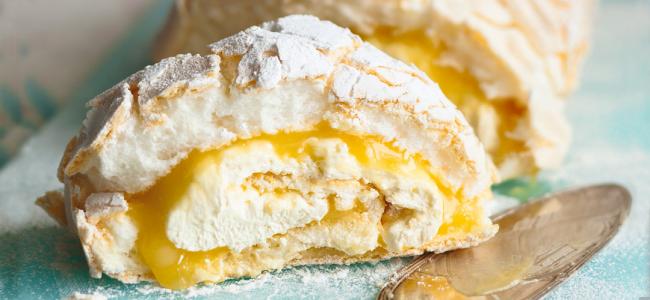 Перейти к приготовлению коржа. В деже взбить белки, не забыв добавить лимонный сок. Выпечь хрустящий корж с конвекцией до плотной корочки. Перевернуть на решетку и остудить. Сверху распределить курд. Украсить меренговый рулет можно цукатами, кусочками мармелада, листочками мяты/ розмарина, полить шоколадной глазурью.