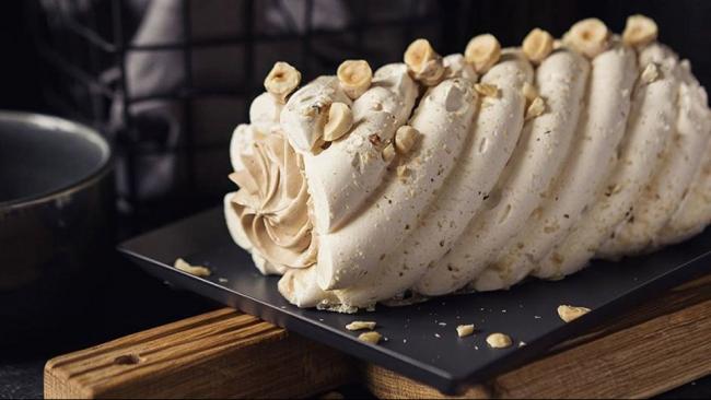 В деже планетарного миксера приготовить сладкую массу с множественными микроскопическими пузырьками. При образовании твердых пиков выложить на силиконовый коврик, выпечь до легкого румянца. Пока она сушится и остывает, сделать начинку из продуктов по рецепту, по очереди вмешивая продукты.