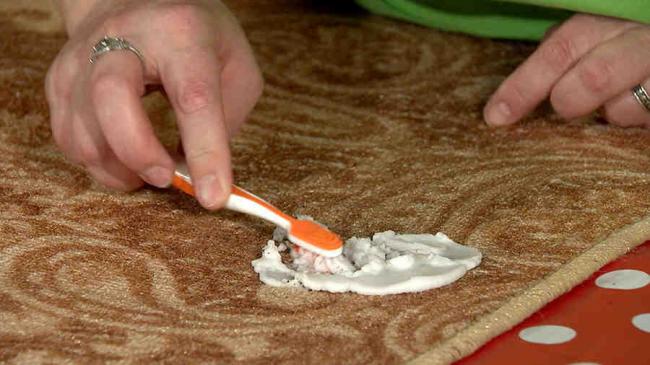 Готовую смесь нанести на ковер мягкими втирающими движениями, оставить на несколько минут. Дважды почистить покрытие чистой водой, тщательно вытереть сухой салфеткой (если на ворсе останется мыло, он будет неприятный на ощупь).