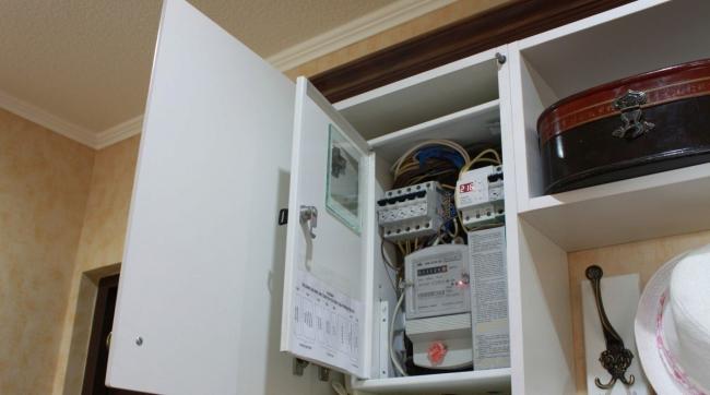 Аппарат в своем неприглядном виде будет располагаться внутри шкафа. Данный способ очень удобен тем, что предполагается легкий доступ к щитку. Чтобы добраться до счетчика, достаточно будет только открыть дверцу шкафа.