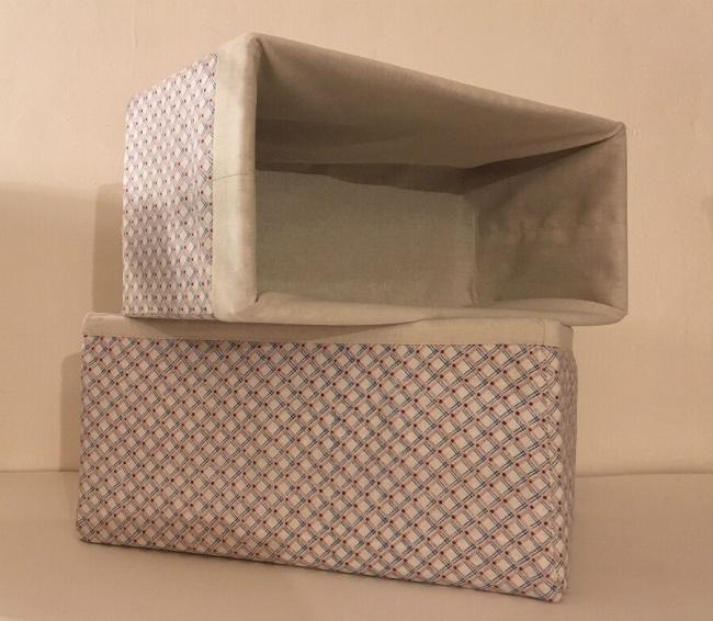 В данной модели коробки для внутренней части и обработки верхнего края используется цветная яркая ткань, а для внешней отделки — однотонная. При необходимости в боковые срезы можно будет вставить “косточки” (реджилин). Тогда готовое изделие будет по максимуму ровным и устойчивым.