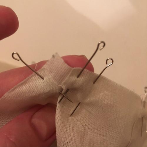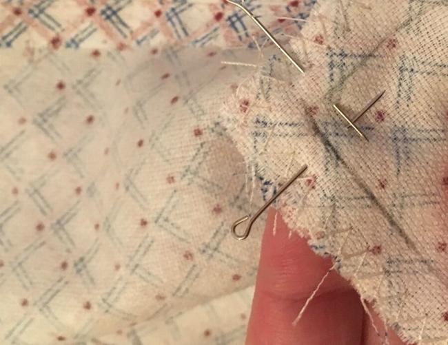Скалывая боковую деталь с деталью дна, расположила швы по центру и сначала поставила булавки в этих местах, а затем сколола остальные части деталей.
