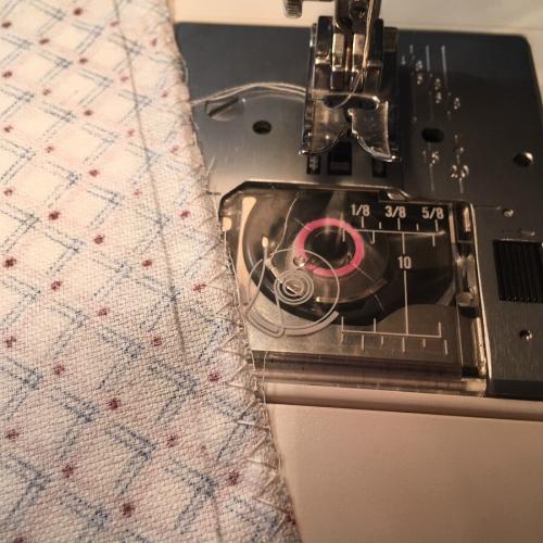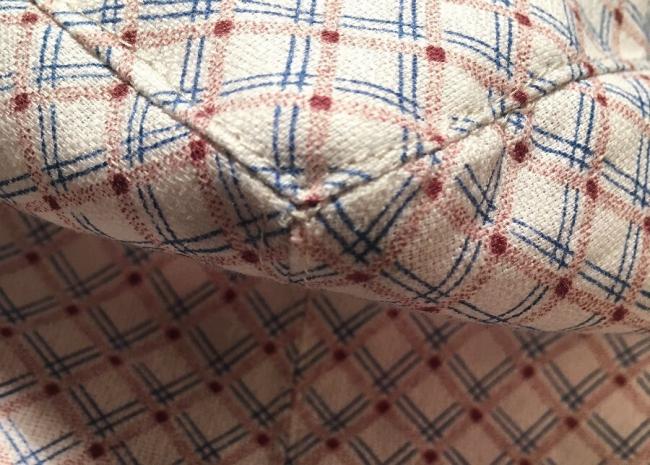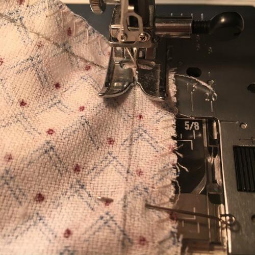 Моя ткань для внешнего чехла сильно осыпалась, поэтому я сразу обработала все припуски детали дна и боковые и нижние припуски остальных деталей из этой ткани зигзагом.