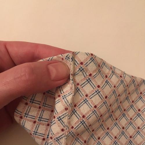- Заготовка обтачки. По всей длине детали сделать подгиб внутрь на 1 см и заутюжить его. Один из краев обтачки оставить открытым. Второй подогнуть на 1 см и зафиксировать утюгом. Подогнутый край в дальнейшем будет накрывать собой противоположный.