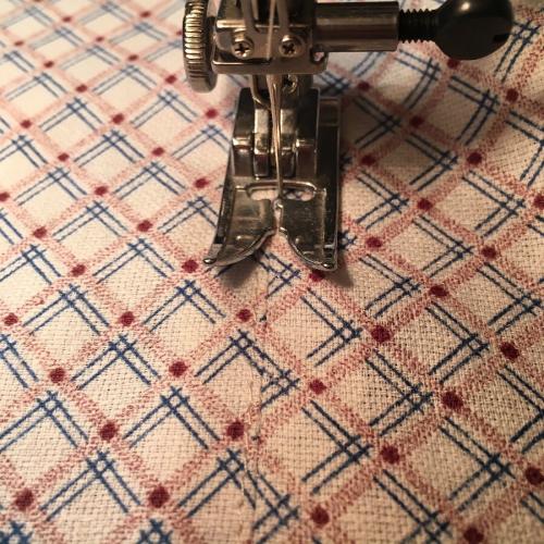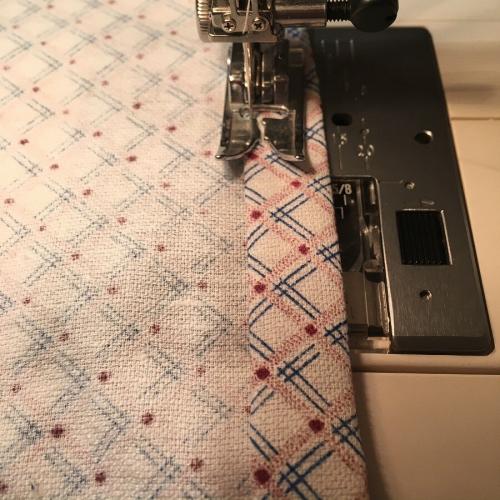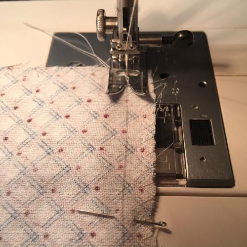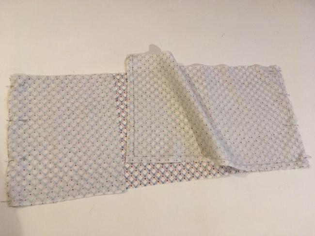 Следующий выбранный отрез ткани накладывается лицевой частью, края совмещаются и закрепляются машинной строчкой. Фото 5
