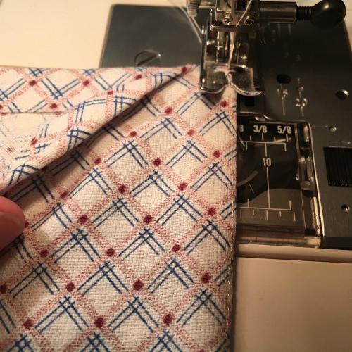 Чтобы чехол лучше сидел на основе, немного сузим его сверху. Сложите верхние края вдоль швов и застрочите уголки, как показано на фото, на 1,5 см, отступив от края 1 мм.
