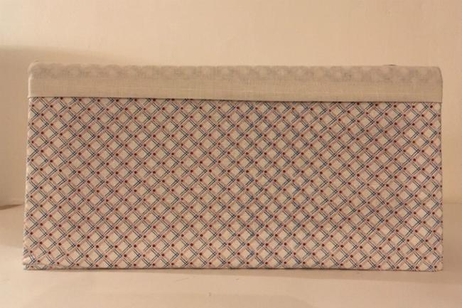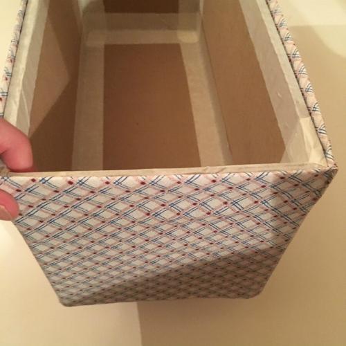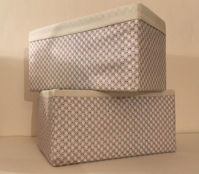 Можно сделать двухслойную коробку почти полностью из ткани, для жесткости вставив между двумя слоями ткани листы картона, специальное пластиковое полотно. Карманы или разделители из ткани предварительно сшиты с внутренней стороны. Крышка может закрываться на липучку, молнию или кнопки.