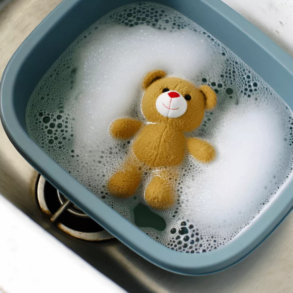 - Намочить игрушку, помять, потереть, а при необходимости пройтись щеткой.