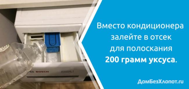 - Кондиционера – делает текстиль более мягким, способствует тщательному выполаскиванию стирального порошка, что позволяет исключить образование белых разводов. Перед стиркой добавьте 200 мл 9-го % уксуса в отделение для ополаскивателя.