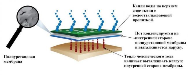 Такие ткани называют мембранными. Они изготавливаются по особым технологиям. Мембрана — тончайшая пористая пленка, задерживающая влагу снаружи, но пропускающая испарения от тела.