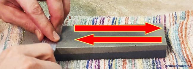 Тем не менее, этот способ является эффективным и одним из самых дешёвых. Найти точильный камень можно практически в любом магазине строительных материалов. Чтобы выполнить заточку, нужно соблюдать угол в 20 градусов.