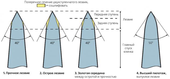Важно понимать, что от формы лезвия зависит то, как правильно заточить нож, то есть под каким углом поперечного сечения режущей кромки нужно производить заточку в каждом конкретном случае