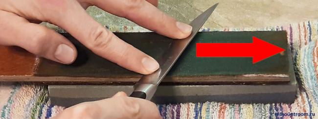 Для лучшего скольжения, брусок смачивают водой (можно протереть губкой с добавлением моющего средства). Сила нажатия не должна быть слишком большой, правильнее контролировать усилия при обработке обеих сторон лезвия, чтобы они были одинаковыми. Движения делают по широкой дуге попеременно: сначала от себя, затачивая одну сторону, а затем к себе, проводя по бруску второй стороной клинка. Вести нож советуют острым краем вперед, от рукояти к острию.