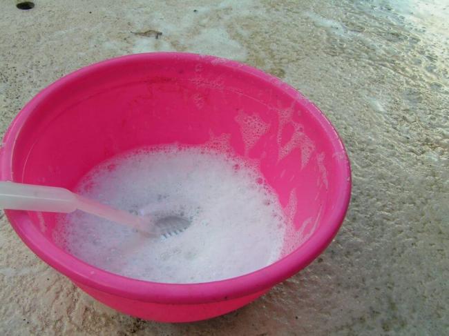 Некоторые хозяйки советуют использовать для стирки хозяйственное мыло. Оно справляется со многими видами пятен, в том числе и от клея. Одежду требуется замочить в тазике с горячей водой и щедро намылить хозяйственным мылом липкие следы. Через 30-60 минут следует прополоскать изделие под водой и оценить результат.