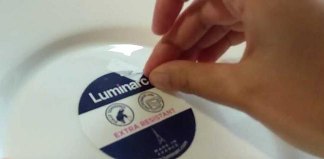 На дне тарелок, или прочей посуды, стикеры присутствуют практически всегда. Поверхность изделий нельзя назвать слишком хрупкой, поэтому некоторые люди предпочитают удалять наклейки механическим способом. Для этого тарелки кладут в воду, чтобы ценник как следует размяк, после чего отскребают клей ножом.
