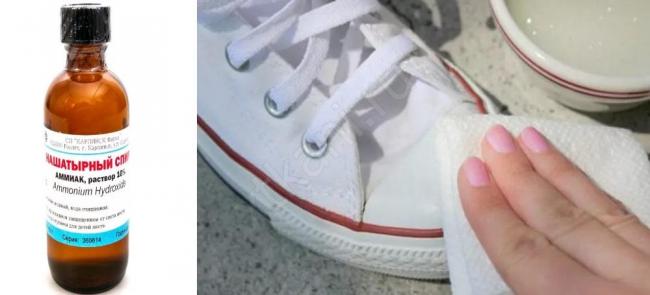 Избавиться от желтых пятен на белой ткани кед поможет старое проверенное средство – нашатырный спирт. Некоторые недооценивают его из-за неправильного использования, но толк в нем все же есть. Перед процедурой кеды должны быть чистыми и сухими. Возьмите бинт или ватный диск и смочите его нашатырем, потрите желтый участок ткани. Оставьте на 20-30 мин, еще раз потрите. Пятна начинают тускнеть не сразу, поэтому приходится повторять процедуру до 10 раз, что потребует от вас терпения. В завершении обувь поласкают и сушат.